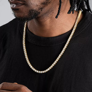 An icier take on your regular tennis chain, the TYG 5mm Tennis Chain is guaranteed to shine bright in any light. Covered with the shiniest CZ Stones. This iconic diamond tennis chain adds sophistication and elegance to any outfit, whatever the occasion.